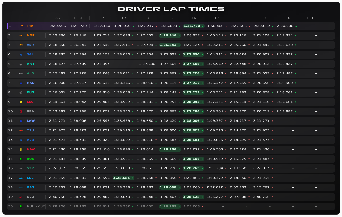 Displays the current race order with each driver's last lap time, personal best lap time, current status, and team color coding. The driver holding the session fastest lap is highlighted in purple. Retired and stopped drivers are clearly indicated. An optional lap history mode adds a column per lap (L1, L2, L3…) with trend arrows showing whether each lap was faster or slower than the previous one.